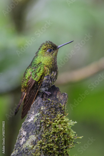 © vaclav, Naklejka premium Female Ruby-throated Hummingbird (archilochus colubris) in flight with a green background