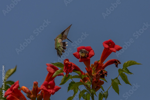 Obraz premium Female Ruby-throated Hummingbird chases another hummingbird out of a trumpet...