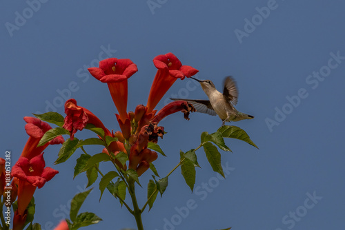 © Judy, Obraz premium Female Ruby-throated Hummingbird checks out a trumpet flower for nectar