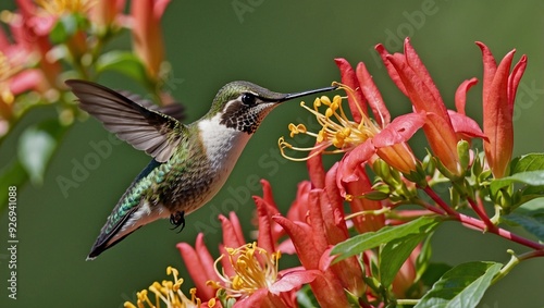 © arif, Obraz premium female Ruby Throated Hummingbird Feeding on Honeysuckle Flowers in Summer