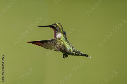 © Janet, Fototapeta premium Female Ruby Throated Hummingbird flying against green lawn on beautiful summer day