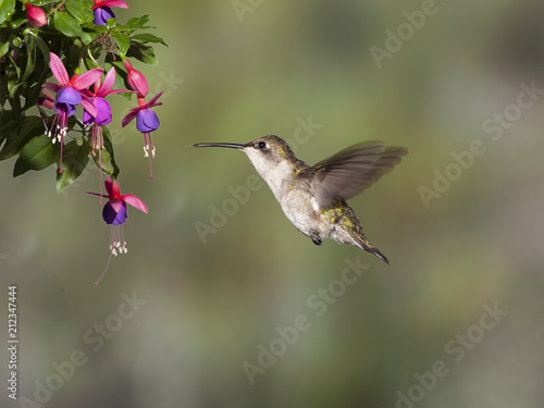 © RIck, Naklejka premium Female Ruby-throated Hummingbird Hovering at Fushia Plant