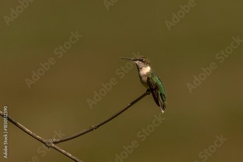 © Judy, Fototapeta premium Female Ruby-throated Hummingbird poses while perched on a twig