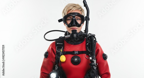 Naklejka premium Female scuba diver in red wetsuit ready for underwater adventure