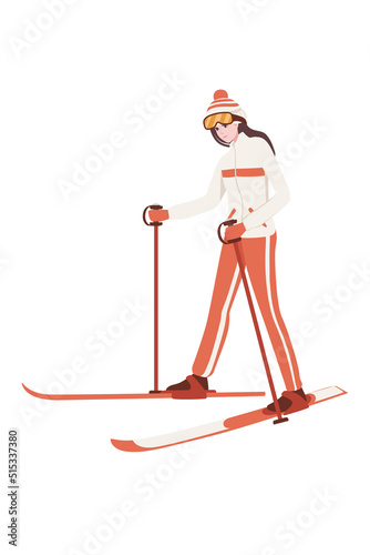 Fototapeta premium Female skier standing still with red ski and sticks and winter jacket cartoon character design vector illustration on white background