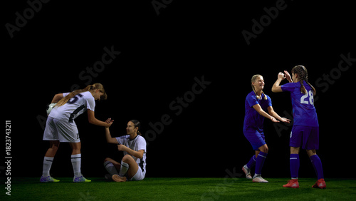 © Lustre Art Group , Fototapeta premium Female soccer players helping teammate after fall during match. Concept of fair play lessons, sports ethics materials, social values education, teamwork campaigns.