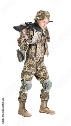 © New Africa, Naklejka premium Female soldier with machine gun on white background. Military service