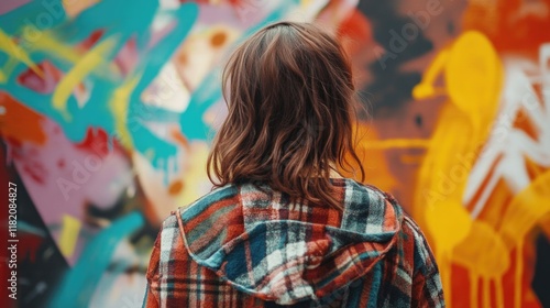 © The 2R Artificiality, Obraz premium Female street artist in plaid jacket observing colorful graffiti wall with vibrant urban art in background, creative expression in city setting