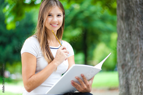 © Minerva Studio, Obraz premium Female student reading a book at the park
