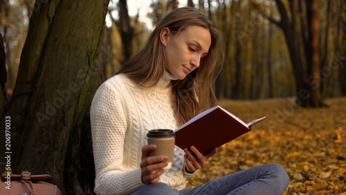 © motortion, Obraz premium Female student reading book, sitting in beautiful park on warm autumn day