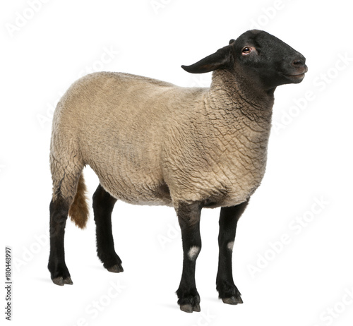 © Eric Isselée, Naklejka premium Female Suffolk sheep, Ovis aries, 2 years old, standing in front of white background