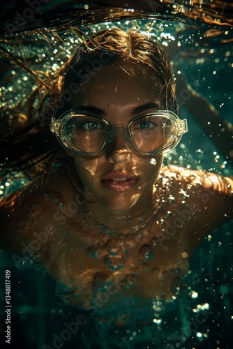 Fototapeta premium Female Swimmer Underwater: A female swimmer, wearing goggles, swimming...