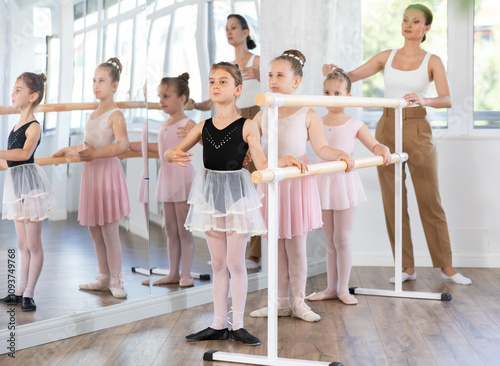 Naklejka premium Female teacher conduct training, performs correction of pose in first position students. Girls engaged in ballet studio, perform repetitions of elements and tasks