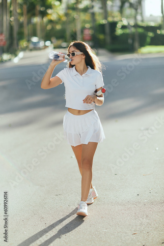 © LIGHTFIELD STUDIOS, Fototapeta premium female tennis player drinking water, young woman with long brunette hair walking in white sporty outfit and holding racket on urban street in Miami, blurred background, healthy habits