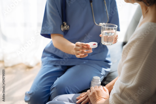 © NINENII, Obraz premium Female therapist recommending pills to elderly patients