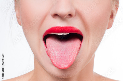 © Dmytro Flisak, Naklejka premium Female tongue and red painted lips