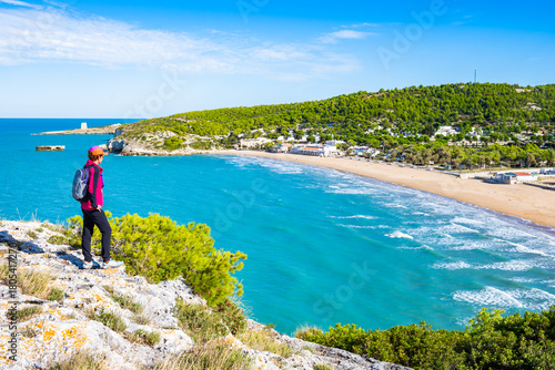 Obraz premium Female tourist at scenic viewpoint overlooking the Adriatic coast and golden beach near Peschici, Apulia, Italy