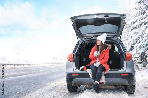© Africa Studio, Naklejka premium Female tourist drinking tea near car in snowy countryside