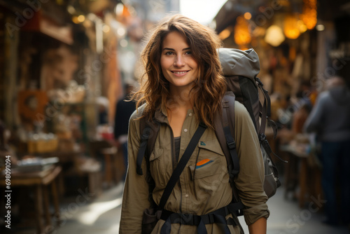 © Lazy_Bear, Fototapeta premium Female tourist traveling with backpack in street. Active holidays in summer, traveling to new cities. Portrait of happy freedom woman