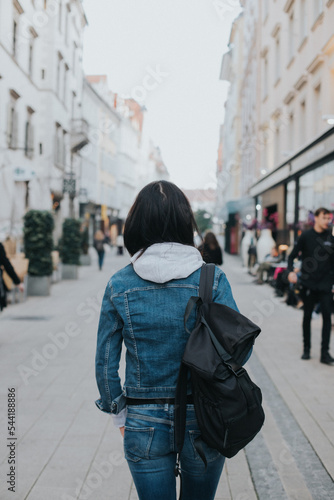 © Міша Мула, Naklejka premium female tourist walks around the city