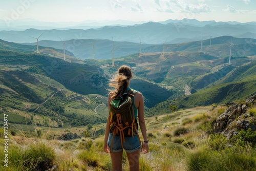 © Dina, Naklejka premium female tourist with a backpack looking over valley with windmills, hiking. Green eco sustainable energy concept.
