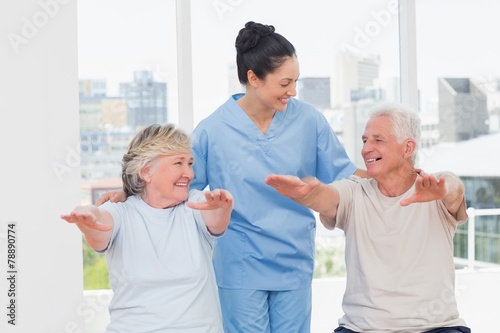 © WavebreakMediaMicro, Obraz premium Female trainer assisting senior couple to exercise