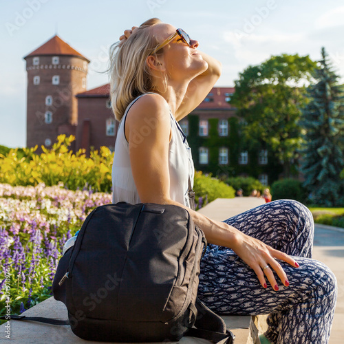 © LALSSTOCK, Fototapeta premium Female traveler sitting and enjoys the view of Wawel Castle.