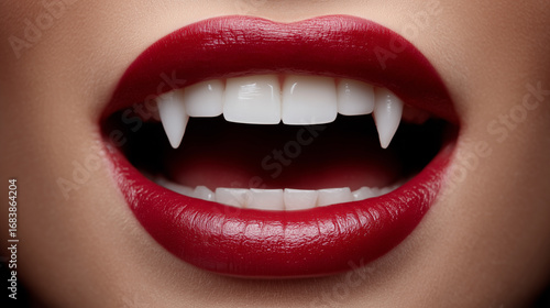 Obraz premium Female vampire fangs with red lips.