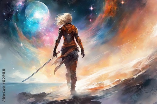 Naklejka premium Female warrior at shore with a sword and a planet in the background