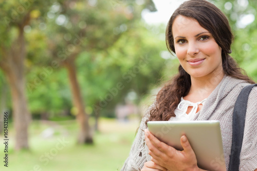 © wavebreak3, Obraz premium Female wearing gray cardigan over white blouse holding tablet and bag in leafy park, copy space
