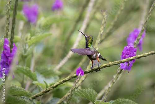 © Ludovic, Fototapeta premium Female Wire-crested Thorntail hummingbird perched on a flowering branch in the cloud forest of Napo, Ecuador. Small neotropical bird resting in its natural habitat with soft green background.