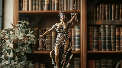 © Lumos Maxima, Fototapeta premium Femida statue on library background. Law and justice concept