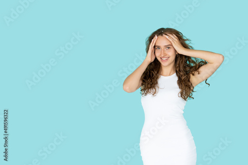 Fototapeta premium Feminine nature. Beautiful woman. Fashion look. Elegant smiling pretty lady in white dress touching hair posing isolated blue copy space.