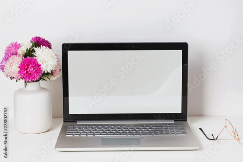 © Diana Vyshniakova, Fototapeta premium Feminine workplace with laptop with white empty screen and flowers in the vase