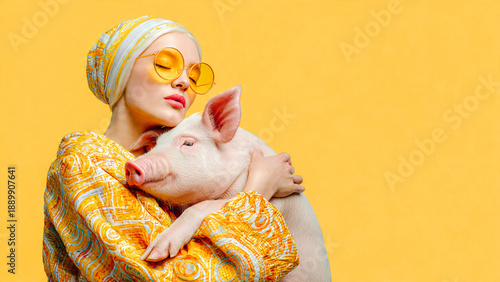 © Concept Photo Studio, Fototapeta premium Femme avec lunettes tenant son cochon rose de compagnie dans ses bras