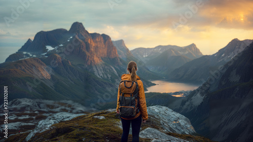 Fototapeta premium femme de os en tenue de randonnée dominant la vallée qu'elle vient d'escalader, soleil couchant