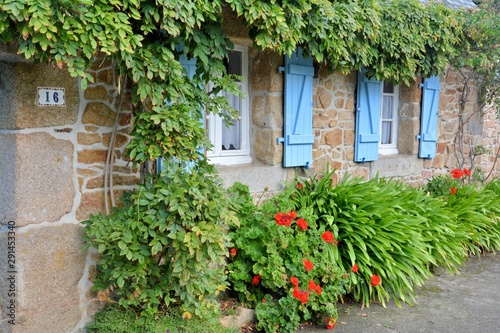 © aquaphoto, Naklejka premium Fenêtres aux volets bleus d'une maison bretonne typique. France