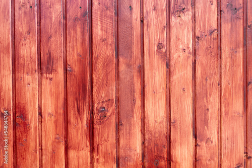 Fototapeta premium Fence made of wood colored with red paint. Carpentry backdrop with copy space