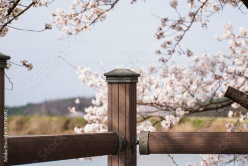© yashis007, Naklejka premium Fence with Beautiful Famous Landscape Cherry Blossoms Tree