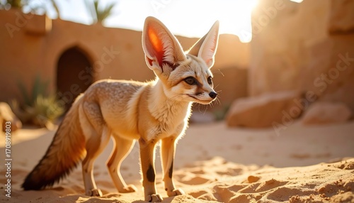 © afriza, Fototapeta premium Fennec Fox in Desert Oasis with Closeup Portrait, and Warm Sunlight.