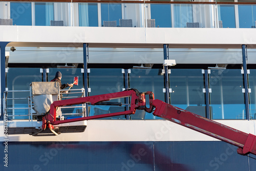 © penofoto.de, Naklejka premium Fensterputzer reinigt die Außenscheiben an einem Kreuzfahrtschiff