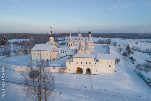 Obraz premium Ferapontov Belozersky Bogoroditse-Rozhdestvenskiy monastery on a frosty December day (aerial photography). Vologda region, Russia