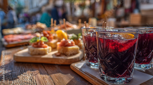 Obraz premium Feria de San Miguel (Sevilla), close-up of tapas and sangria on a wooden table, blurred background of fair activity