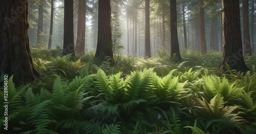 Fototapeta premium Ferns and wildflowers growing in a shaded clearing under long leaf pines,...