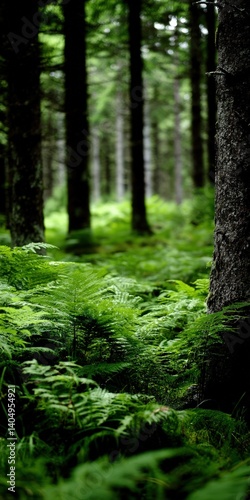 © BrandwayArt, Naklejka premium Ferns flourish under tall trees in the forest