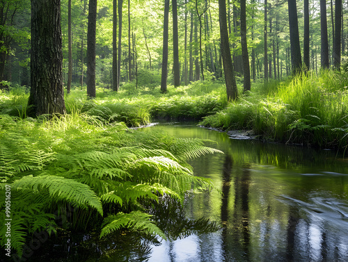 © Zape, Obraz premium Ferns growing along a stream in a peaceful forest.