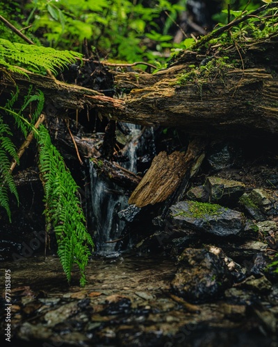 Fototapeta premium ferns, rocks and water on the forest floor of a stream