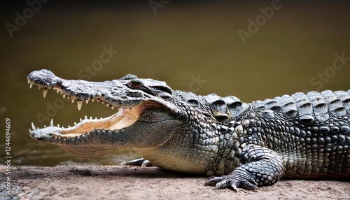 Obraz premium Ferocious Mugger Crocodile Baring Teeth in Striking Riparian Environment,...