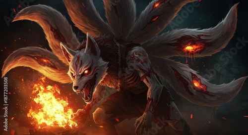 Obraz premium Ferocious nine tailed creature with glowing eyes manifests intense flame