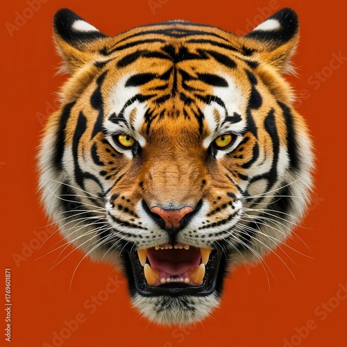 © Hungarian, Fototapeta premium Ferocious tiger head displays intense yellow eyes and bared teeth against a solid backdrop
